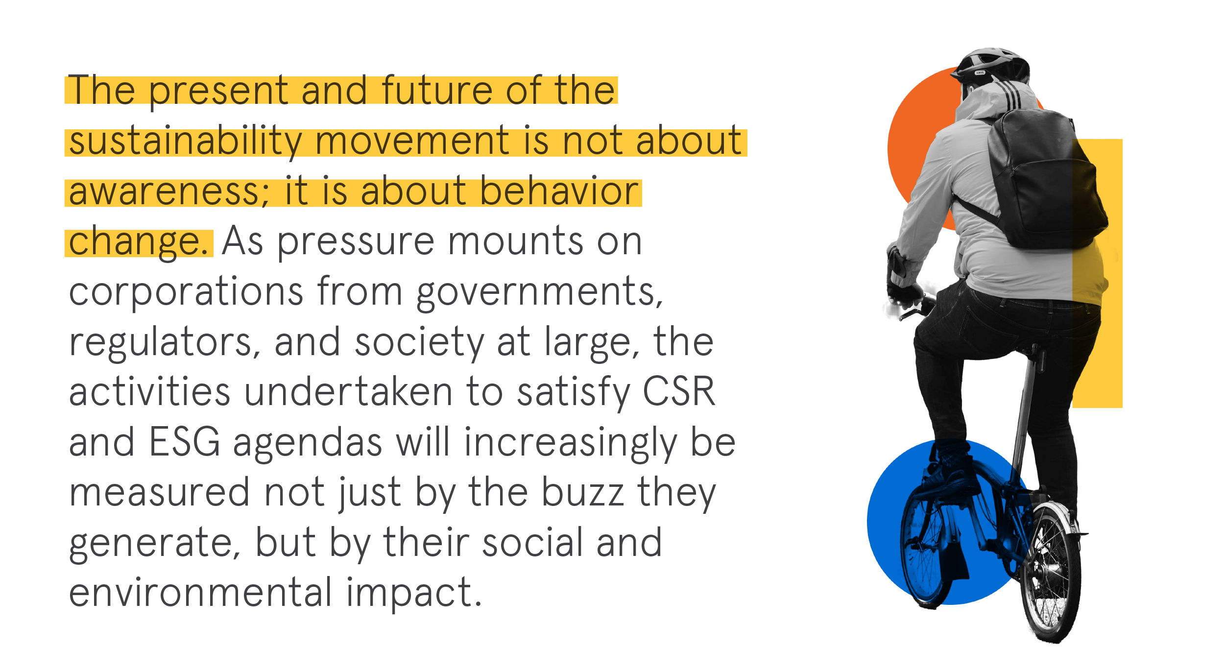 A well-constructed behavior change initiative spans the entire psychological journey from awareness to motivation, commitment, and action—and eventually, to habit formation. But even these are only as good as the impact they generate in the name of sustainability. This highlights another shortcoming of traditional sustainability campaigns: their downstream effects on sustainable behaviors and practices cannot be measured. They are not subjected to controlled testing in a manner that would demonstrate a causal link between the campaign and any resulting behavior change. But perhaps even more concerning is that such campaigns and initiatives often stop short of even specifying the particular behavior changes they are meant to affect, leaving companies, governments, and market research agencies to fall back on vanity metrics such as “awareness” or “engagement” to indicate success.